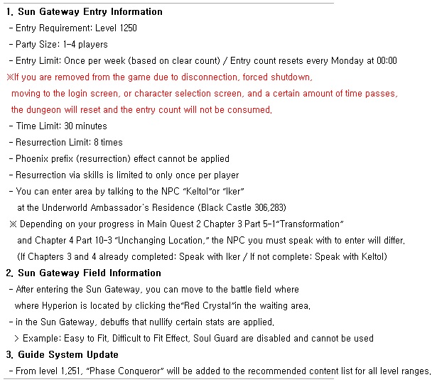 - A new high-difficulty challenge content, “Phase Conqueror,” is now available in Red Stone Online! - Defeat the forces of followers appearing in the Phase Fields and challenge the Phase Conqueror: Magnificent Sun Hyperion!  [Phase Conqueror Overview] New content has been added for characters Lv. 1,250 and above, including: [Phase Fields] – a new area accessible to high-level characters [Gate of the Sun] – the battlefield where the new boss Hyperion (Phase-type) awaits The Phase Conqueror content will be displayed at the top of the content category list starting from Lv.1251. Characters Lv. 1,250 or higher will automatically receive the "Phase Conqueror" quest upon logging in.