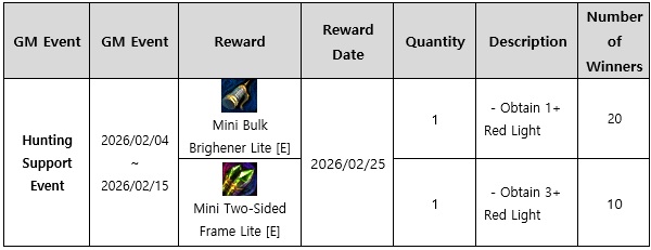 5. Hunting Support Event! [Duration and Details, In-game time UTC-8] - Players who obtained Red Light by opening Red Stone Energy will chance to win a reward above - The rewards will be provided to the winning character's inventory during the maintenance (reward date) - Only one character per account will be selected to receive the event rewards