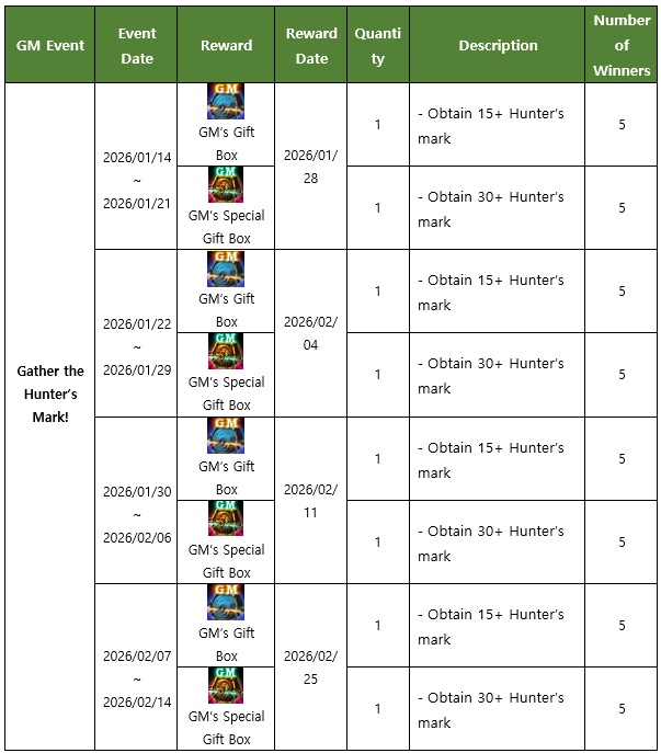 3. Gather the Hunter’s Mark! [Duration and Details, In-game time UTC-8]  - Players who obtained hunter’s mark by hunting the monsters will chance to win a reward above. - Event rewards will be provided to a total of 50 Characters - The rewards will be provided to the winning character's inventory during the maintenance (reward date) - Only one character per account will be selected to receive the event rewards.