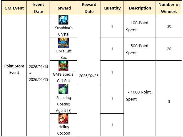 2. Point Store Event [Duration and Details, In-game time UTC-8]  - Every character that spends over 100 points, 500 points, and 1000 points at the points store has a chance to win the rewards as mentioned above. - Event rewards will be provided to a total of 55 characters. - The rewards will be provided to the winning character's inventory during the maintenance on the Reward Date. - Only one character per account will be selected to receive the event rewards