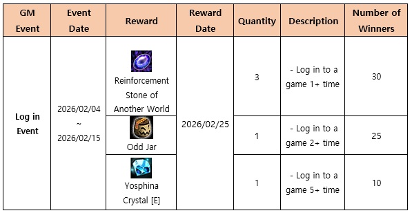 4. Log in Event [Duration and Details, In-game time UTC-8]  - Players who log in (log in counts only once per day) during the event have a chance to win the rewards mentioned above. - You will need to log out and log back in if you stayed logged in past 00:00(in-game time). > (ie. If you logged in at 21:00(in-game time) and stayed logged in until 03:00(in-game time) the next day without reconnecting, it would count as 1 log in.) - Event rewards will be provided to a total of 65 characters. - The rewards will be provided to the winning character's inventory during the maintenance (reward date) - Only one character per account will be selected to receive the event rewards.