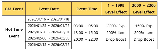 1. Hot Time Event [Duration and Details, In-game Time UTC-8]  - All adventurers playing Red Stone will receive 200% EXP / 200% Item Drop boost during the event period. - For 2000+ Level characters, the hot time event will be applied as follows: 125% EXP / 200% Item Drop Boost - During certain Hot Time event periods, a stronger Hot Time effect (300%) will be applied. For detailed schedules, please refer to the table above.