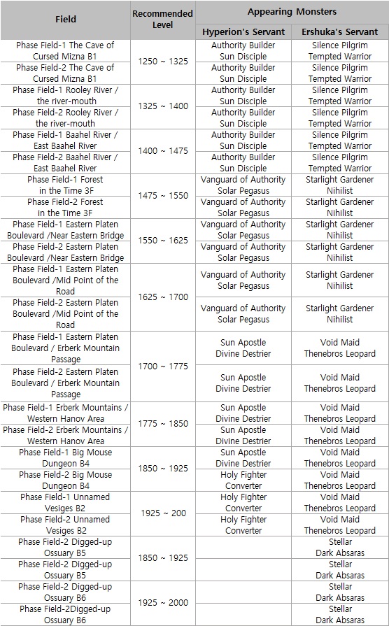 Phase Field - New “Phase Soldiers of Ershuka (Phase-type)” monsters opposing Hyperion’s forces appear in existing Phase Fields, and four Mirror Fields are converted into Phase Fields. - Phase Soldiers of Ershuka have a low chance to drop Tesseract upon defeat. - Entry is granted after completing the quest “Another Phase Conqueror” via NPC Kertol or Iker. - A new Phase Field property, “Max CP Maintenance Effect Disabled,” has been added.