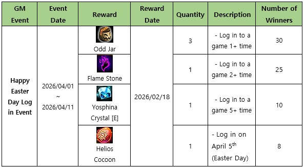 - Players who log in (log in counts only once per day) during the event have a chance to win the rewards mentioned above.