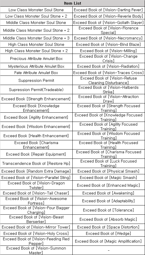 - Players can enter Elimination freely once per day. - All Elimination will be available from level 800 and above. - You can obtain Elimination Reward Box and Elimination Badge ingredients for each boss elimination if you clear the first entry for the day - Badge ingredient items are not included in 800 level elimination rewards. - You need Suppression Permit to enter elimination again after using free entry for the day. - Suppression Permit can be used to enter all types of elimination. - You can get Suppression Permit when opening Red Stone Energy, up to 100 per week. - You can exchange 10 Suppression Permit to a tradable Suppression Permit from the Elimination NPC in [High Brunenstig Adventurer Association Bar]. - When entering Elimination as a party, all party members must have Suppression Permit or daily free entry available.