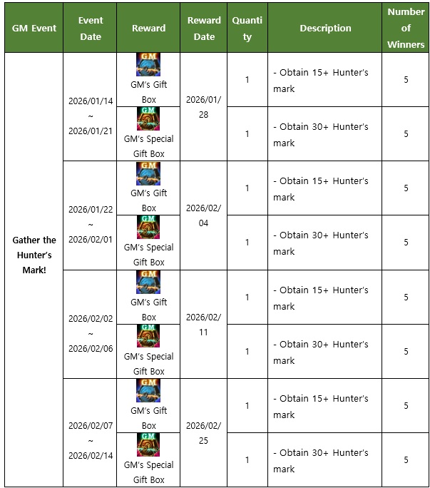 3. Gather the Hunter’s Mark! [Duration and Details, In-game time UTC-8]  - Players who obtained hunter’s mark by hunting the monsters will chance to win a reward above. - Event rewards will be provided to a total of 50 Characters - The rewards will be provided to the winning character's inventory during the maintenance (reward date) - Only one character per account will be selected to receive the event rewards.