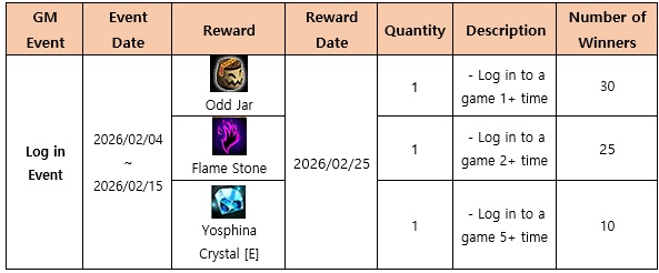 4. Log in Event [Duration and Details, In-game time UTC-8]  - Players who log in (log in counts only once per day) during the event have a chance to win the rewards mentioned above. - You will need to log out and log back in if you stayed logged in past 00:00(in-game time). > (ie. If you logged in at 21:00(in-game time) and stayed logged in until 03:00(in-game time) the next day without reconnecting, it would count as 1 log in.) - Event rewards will be provided to a total of 65 characters. - The rewards will be provided to the winning character's inventory during the maintenance (reward date) - Only one character per account will be selected to receive the event rewards.